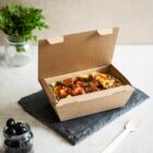 Premium performance hinged box to retain heat. Lightweight, sturdy and stackable. Ideal for hot or cold, for delivery or food to go. Suitable for hot cabinets. Made from microflute corrugate board with a compostable inner coating. Plain brown kraft colour. Award-winning quality , made from plants. Commercially compostable where accepted.