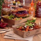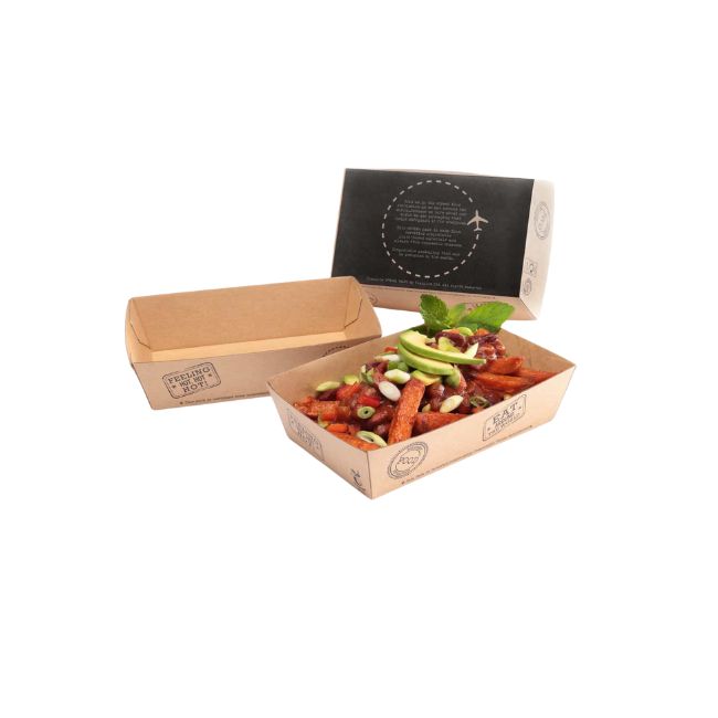 A recyclable, home and industrially compostable fast food tray, it is made from a premium, sustainably sourced material (double-sided corrugated kraft board) with a stackable, sturdy construction to protect against leeks and seeps.